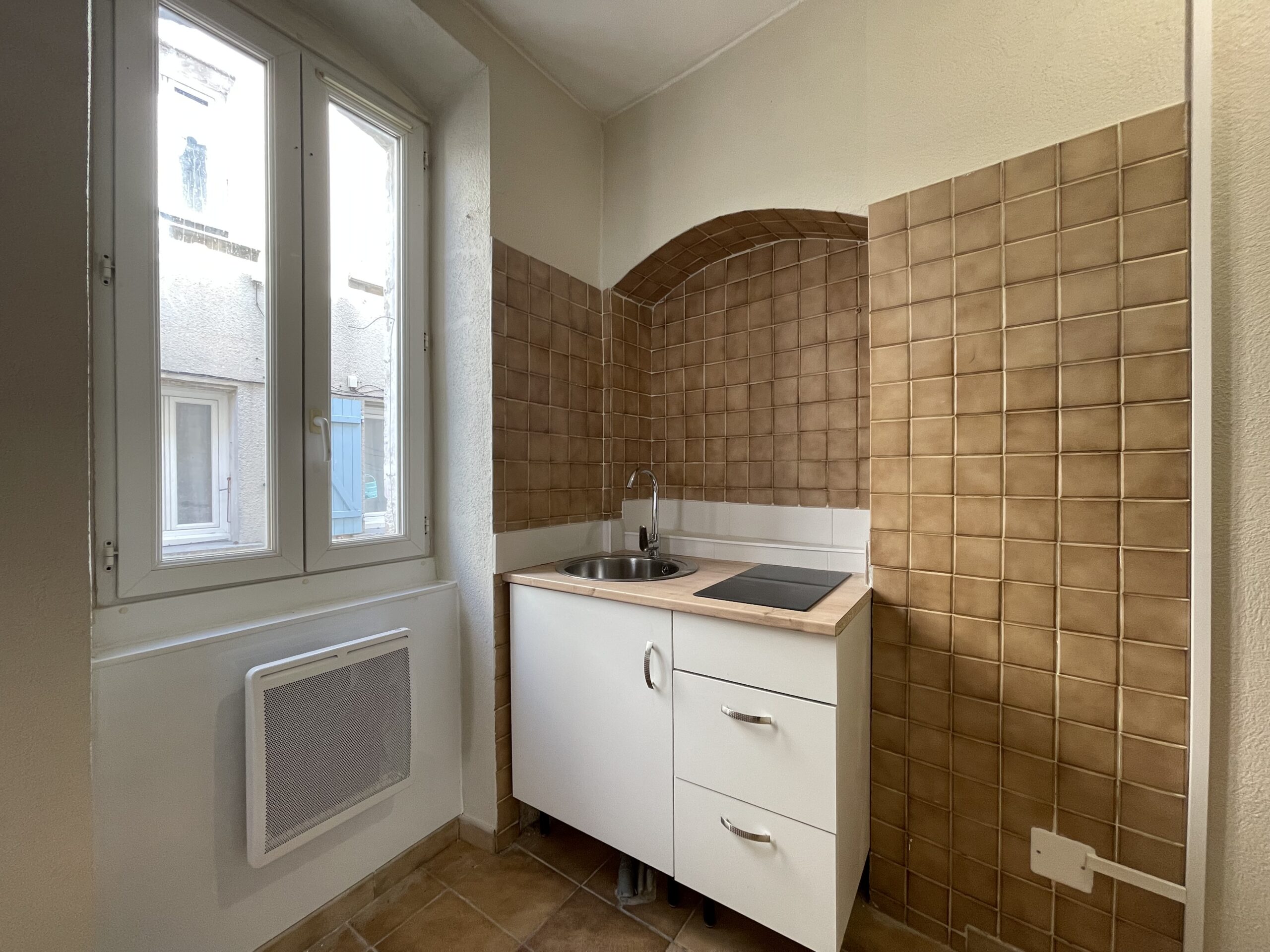 Il est composé d’une entrée, d’un salon, d’un coin cuisine équipée d’un évier et plaque de cuisson et d’une salle d’eau avec WC